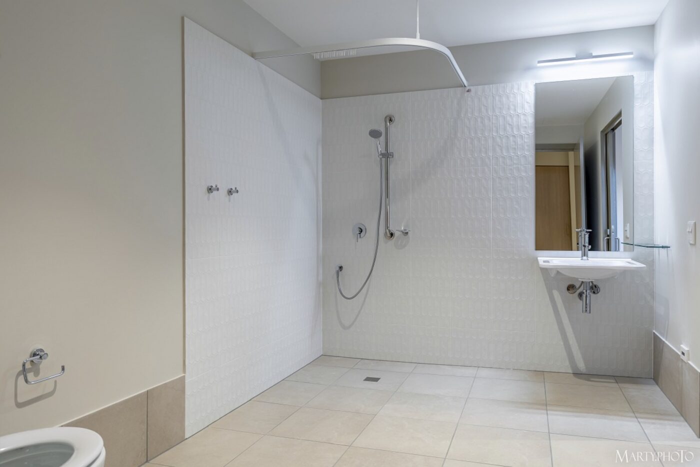 Internally, the facility is equipped with advanced technology to assist people with high physical needs. Features include facial recognition access, voice activated controls and heavy duty ceiling hoists to transport participants safely from their bedroom to the bathroom.