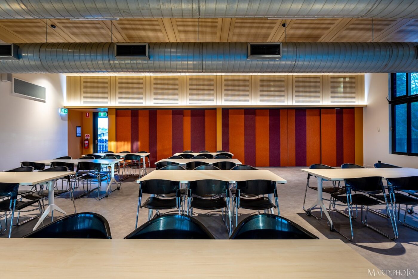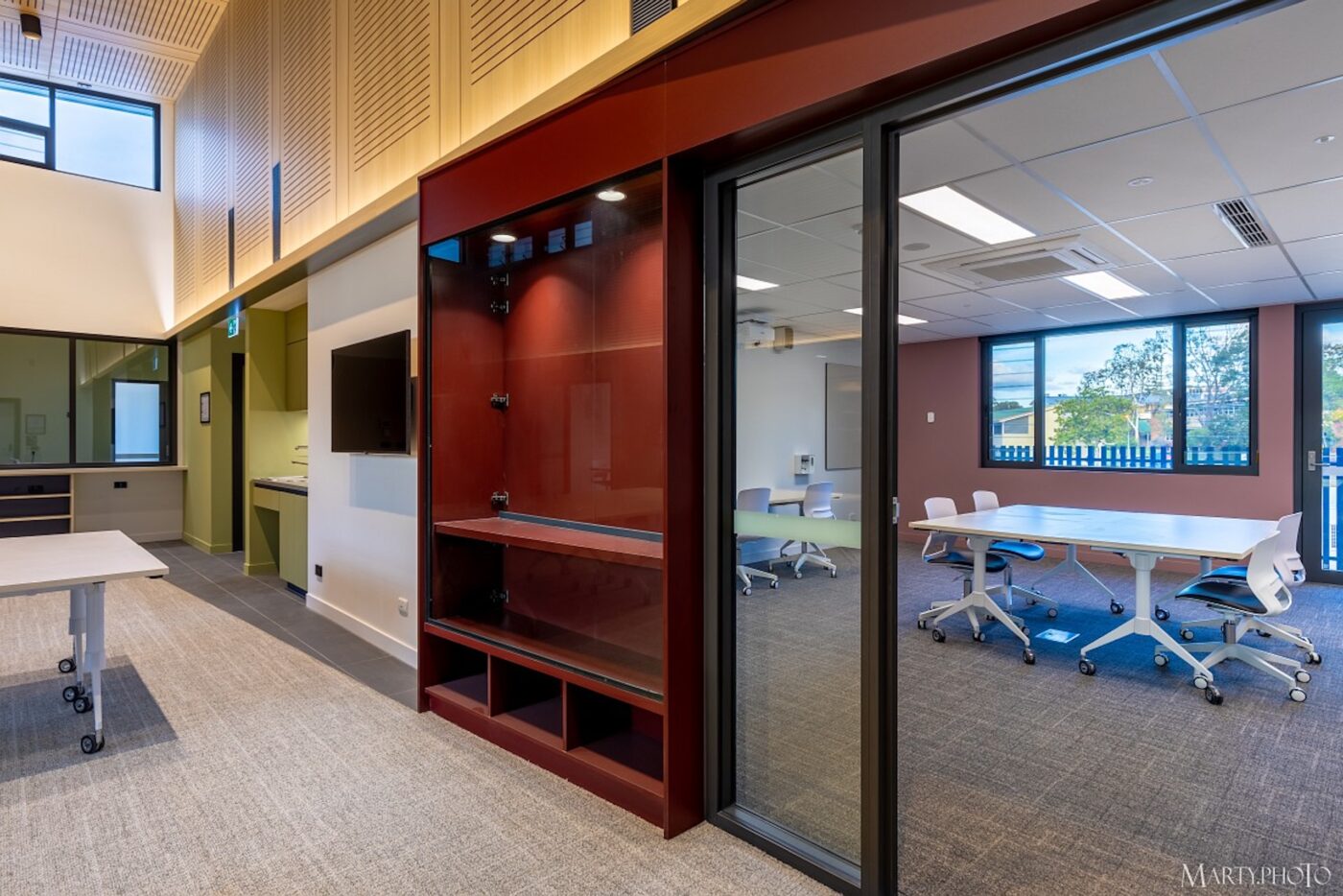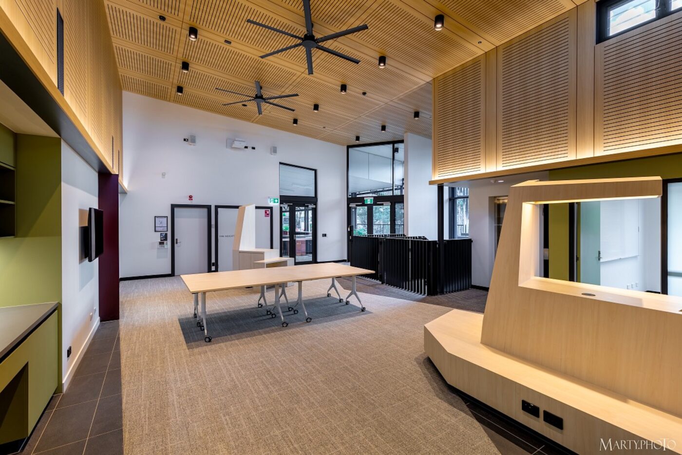 This Design & Construct project consisted of a new community centre and associated infrastructure at the old TAFE college site at Yeronga in Brisbane. The build included a number of special components to accommodate the broad range of tenants, including a model train room facility and a large industrial kitchen. The decor wood high level ceiling gives the building a unique and warm feel while the different colours throughout the building provide a more modern and bright look.